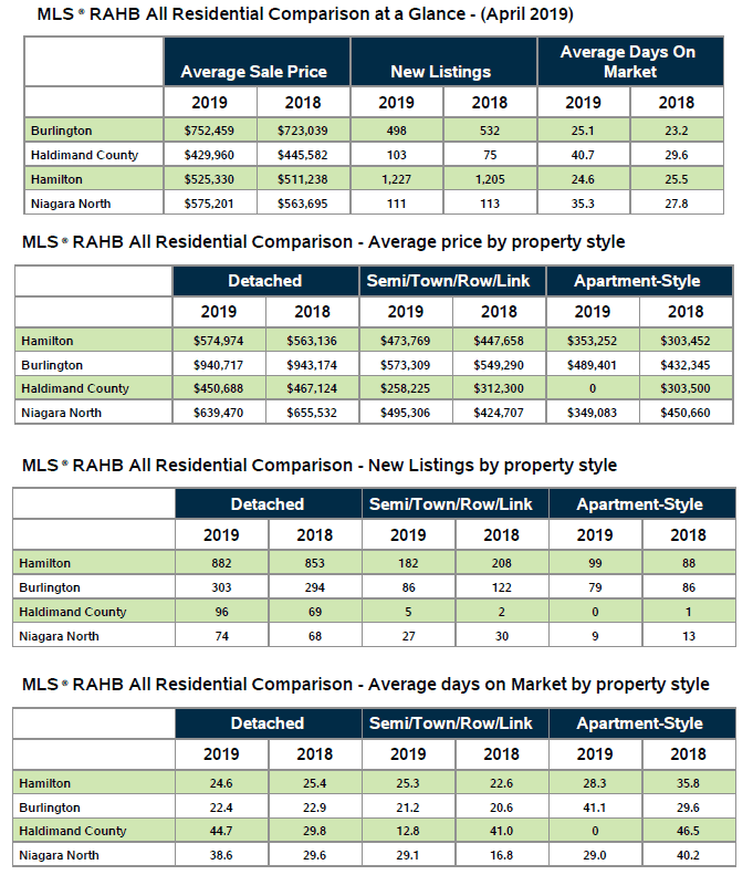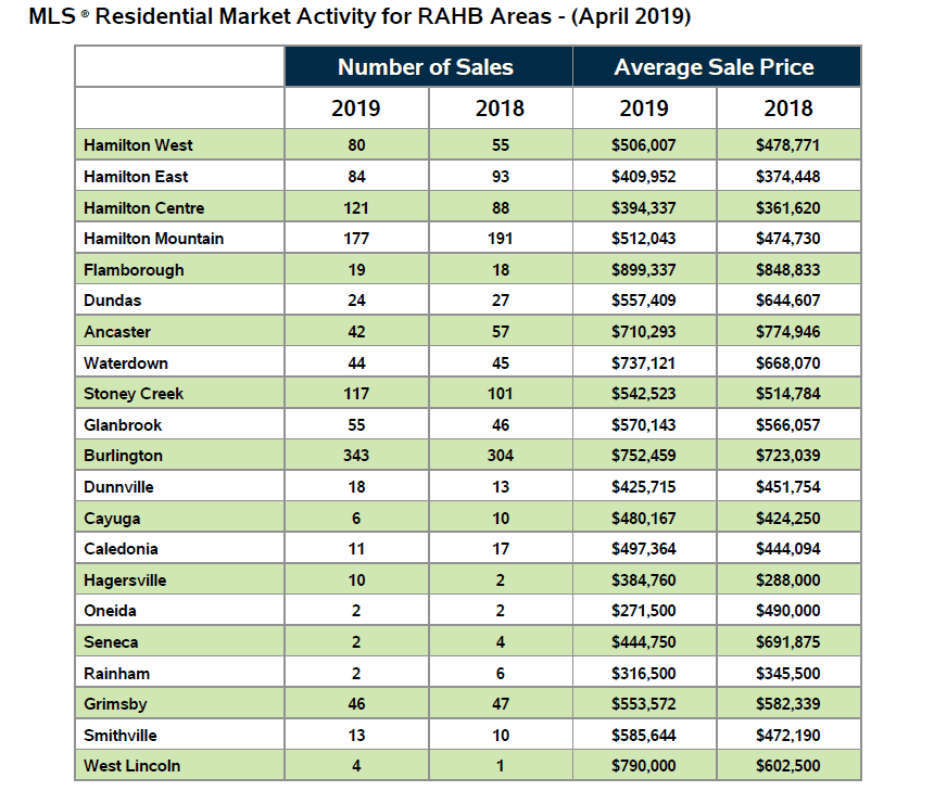 Hamilton, ON (May 1, 2019) – The REALTORS® Association of Hamilton-Burlington (RAHB) reported 1,226 sales of residential properties located within the RAHB market area were processed through the Multiple Listing Service® (MLS®) System in April, 2019. This is a 6.3 per cent increase from April last year, as well as an 18.8 per cent increase over March 2019 and a 66.8 per cent increase over February 2019. The average price for residential properties increased by 3.9 per cent from April 2018 to $589,324.