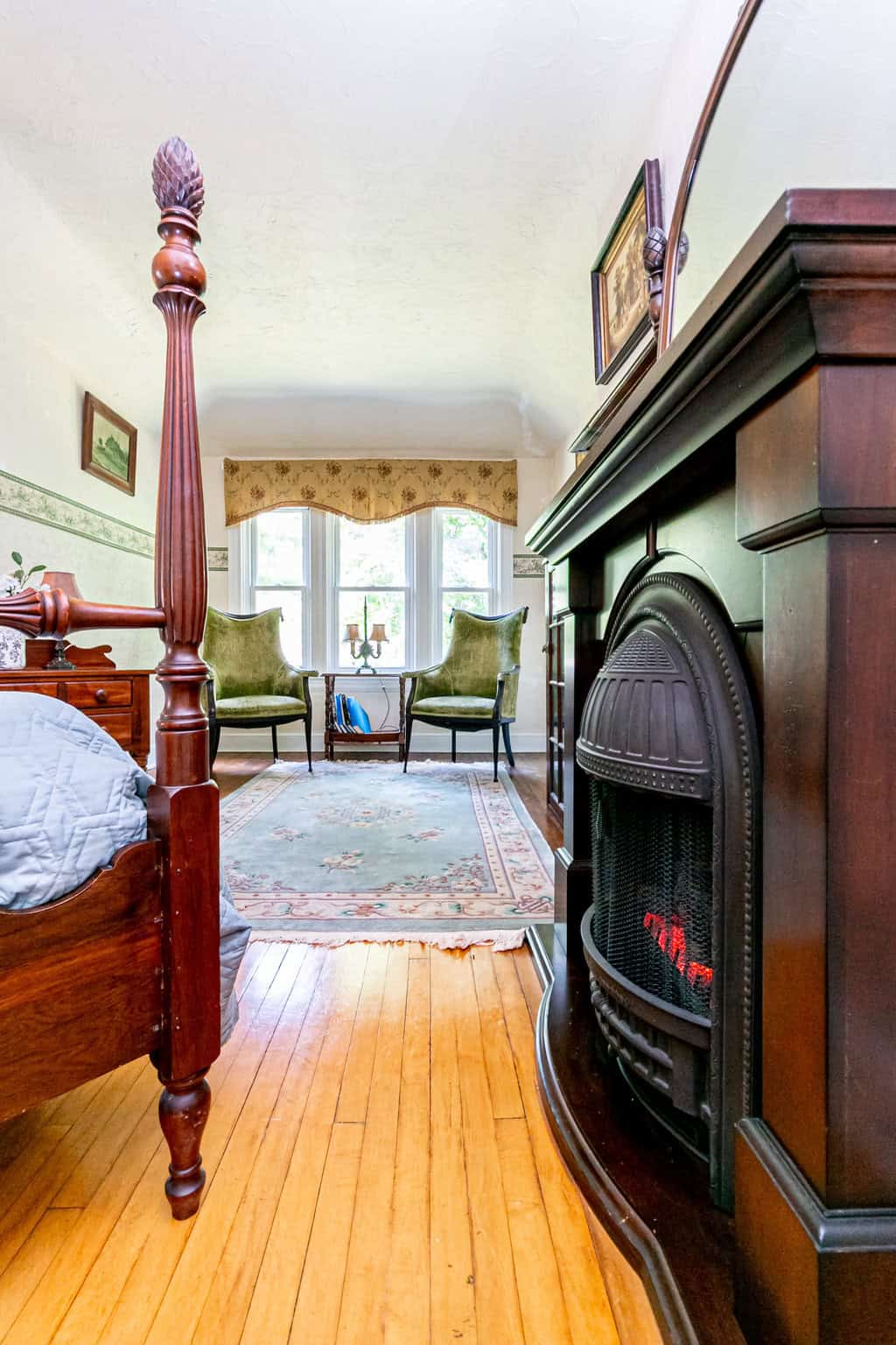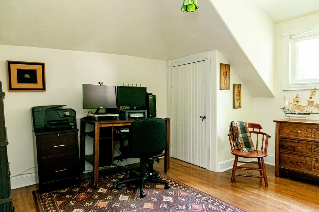 Separate staircases lead to the 2nd floor, where you’ll find a rear bedroom or den, full bath, ample storage, and a generous primary retreat with dormer windows, electric fireplace, and walkout to an enclosed terrace overlooking the streetscape and treetops beyond.